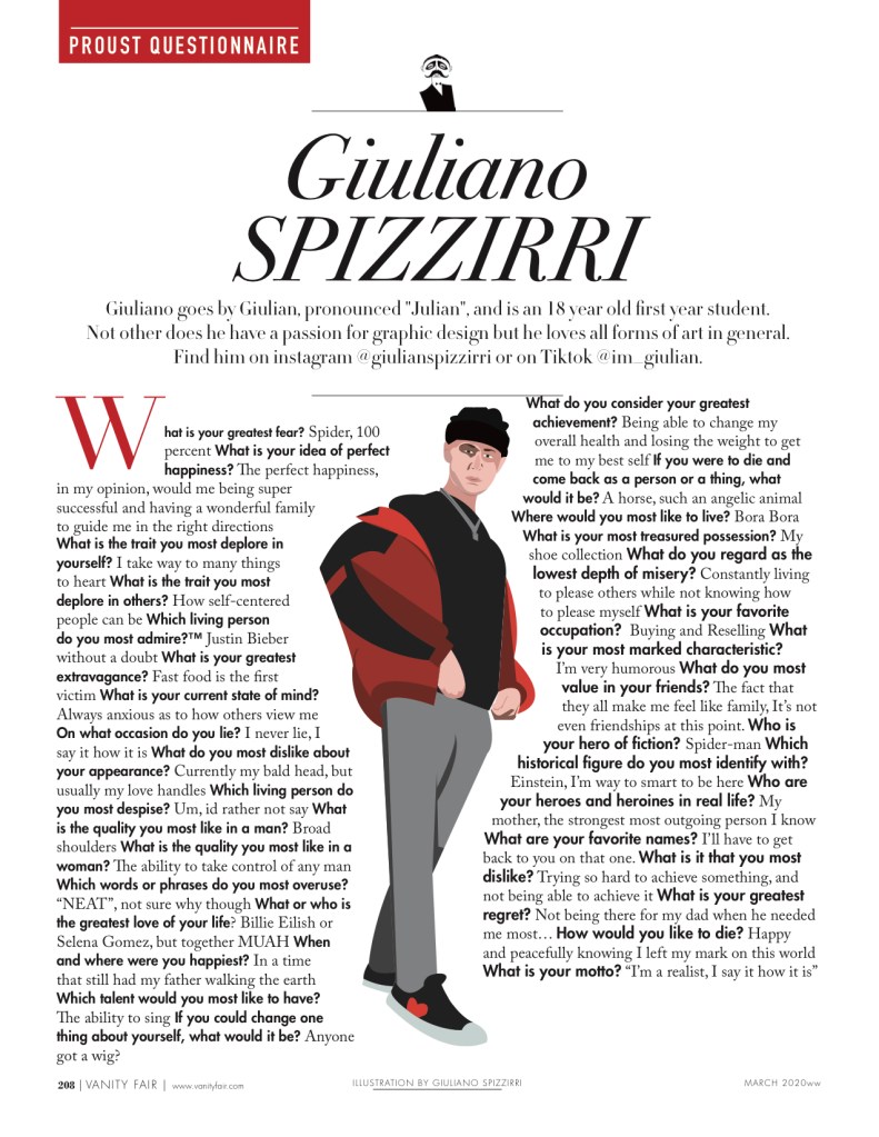 This Proust Questionnaire was a project given the student of my “Design Thinking II” class. We were given a thirty-five question questionnaire, that we were to answer with as much freedom as possible. After answering the questions we were to put it into a Vanity Fair Template.